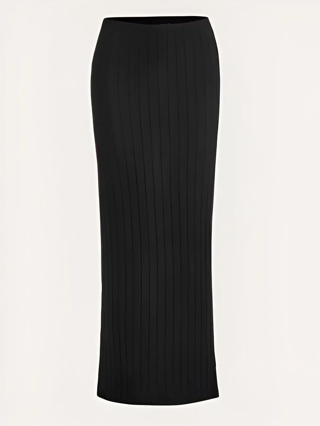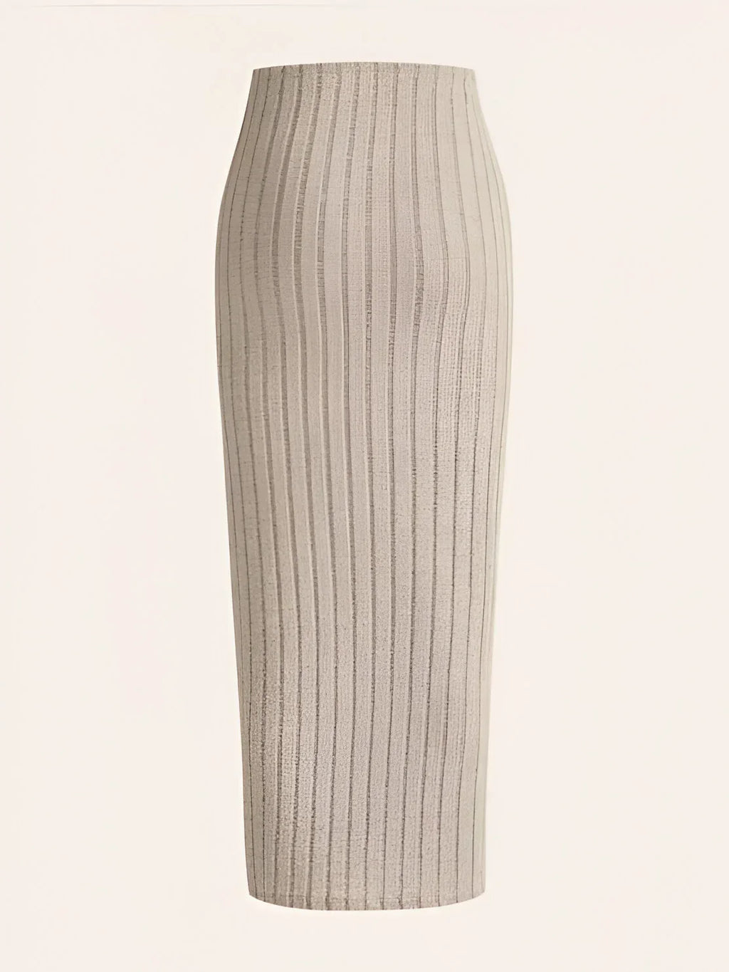 This high-waist ribbed knit pencil skirt is an essential basic for your wardrobe. With its sleek, form-fitting silhouette, it pairs perfectly with crop tops, blouses, or sweaters. The soft, stretchy fabric offers a comfortable yet structured look, making it an excellent choice for both casual and elegant occasions.