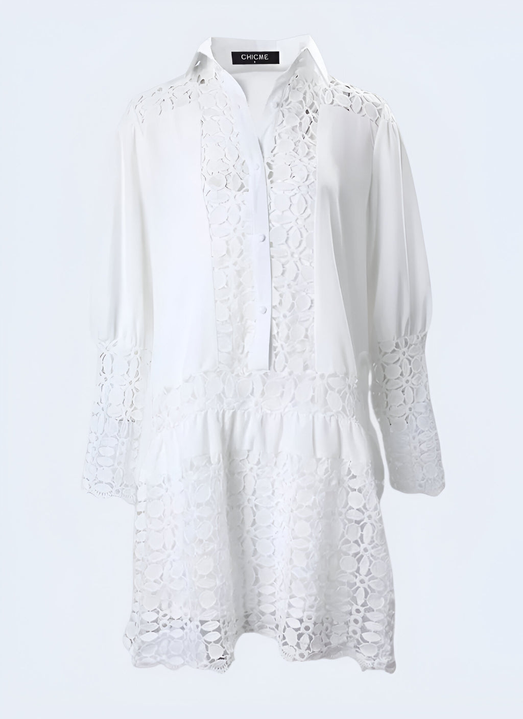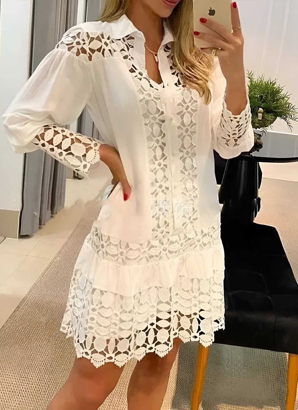 This dress features an stylish combination of lace stitching, a hollow-out design, and a flattering silhouette. The long sleeves and lace-up detail add a touch of sophistication, making it perfect for both casual and formal occasions.