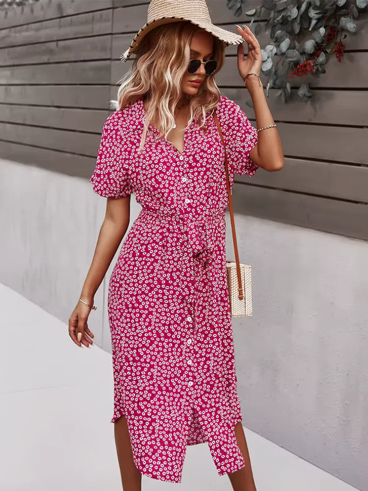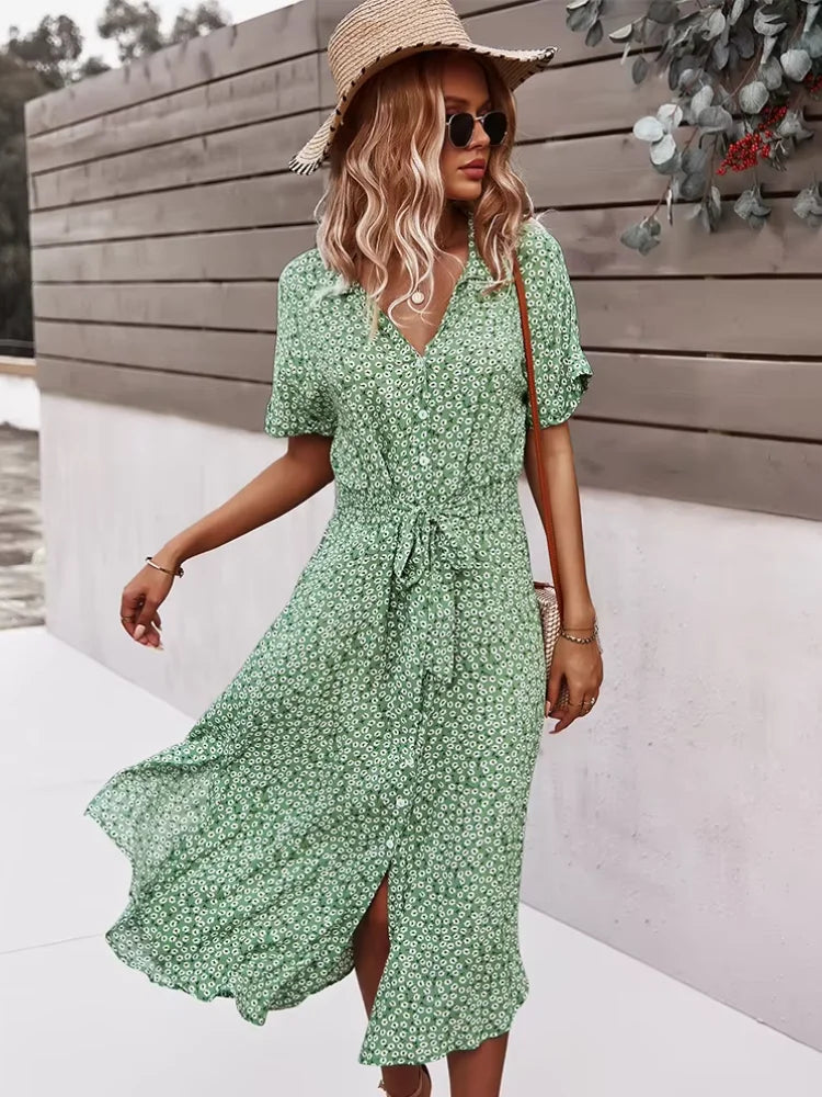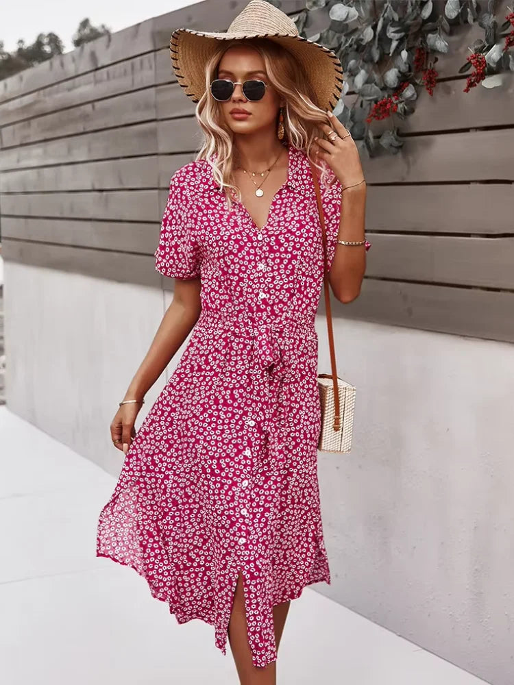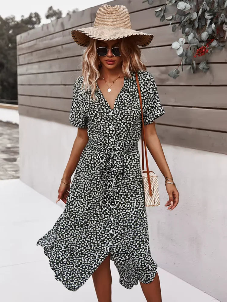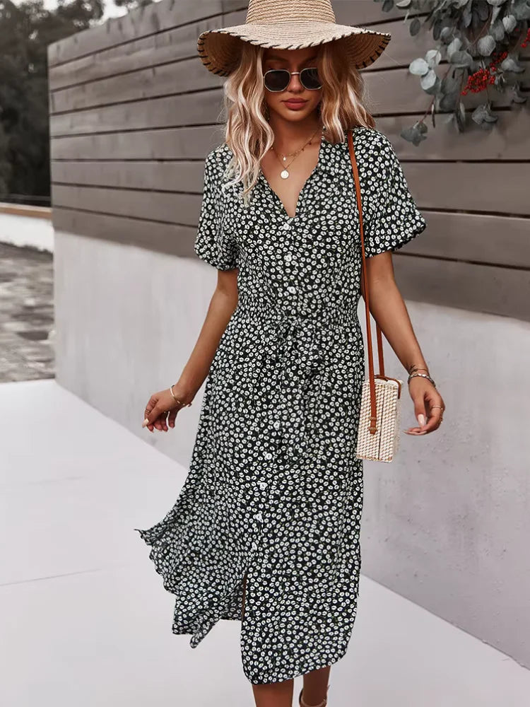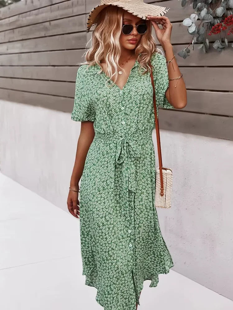 Designed with a relaxed midi length and a timeless V-neckline, this dress offers both elegance and comfort. The flowy fit complements all body types, while the short sleeves add a breezy, casual touch. Suitable for everything from beach outings to semi-formal gatherings, it’s a versatile choice for any summer occasion.