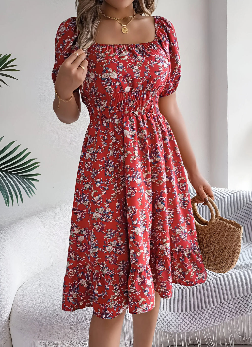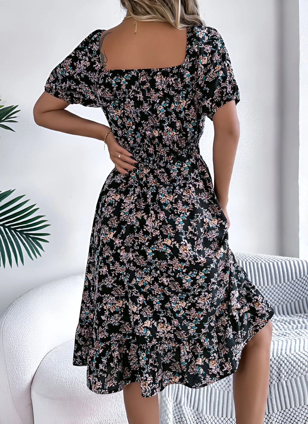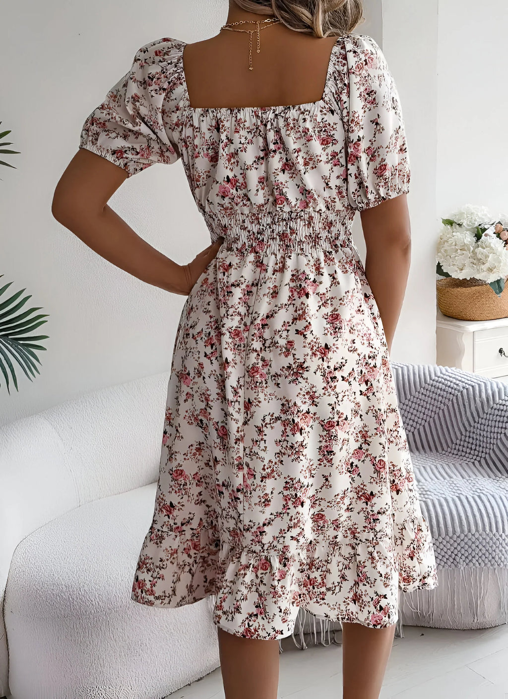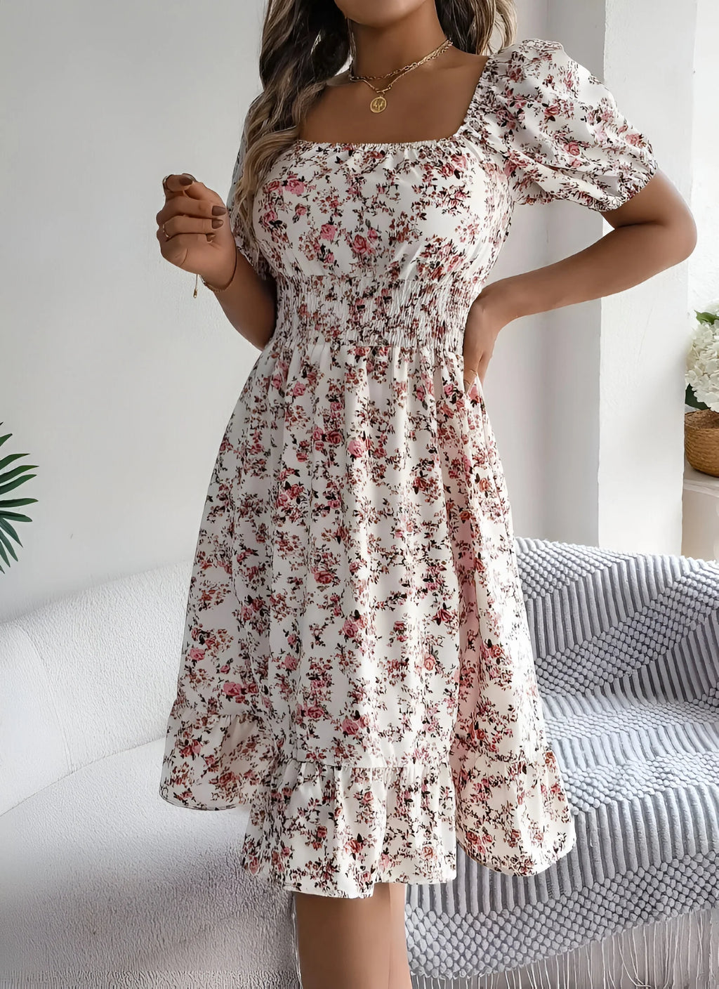 Step into effortless charm with this floral midi dress, designed to bring out your femininity with its romantic details. The flattering square neckline and puff sleeves add a timeless touch, while the smocked bodice ensures a comfortable, figure-hugging fit. Whether for a garden party or a casual day out, this dress is your go-to choice for refined yet relaxed style.