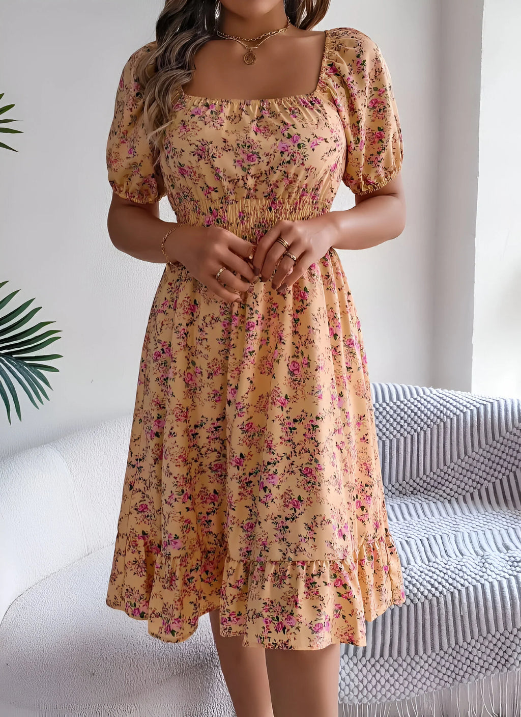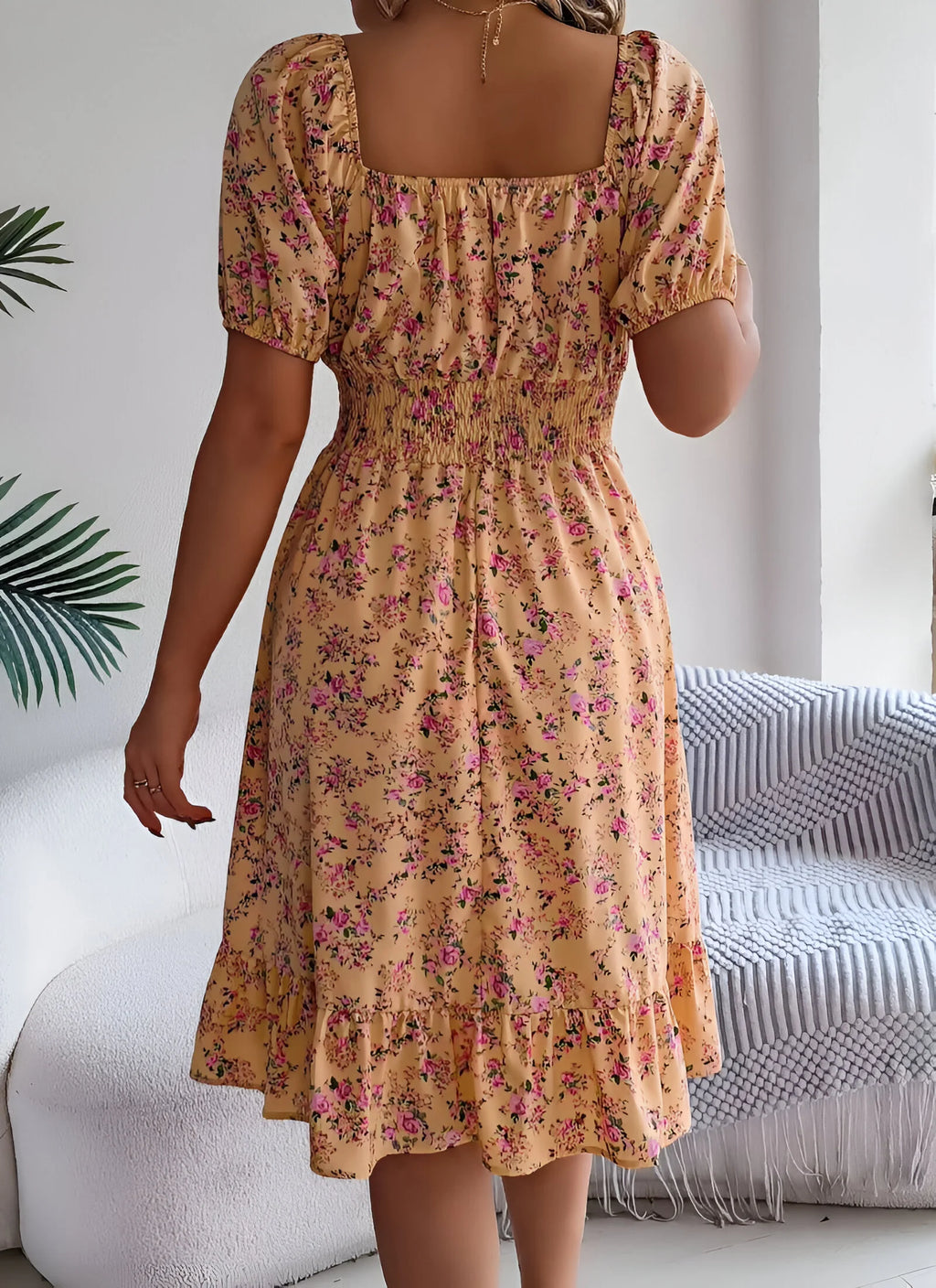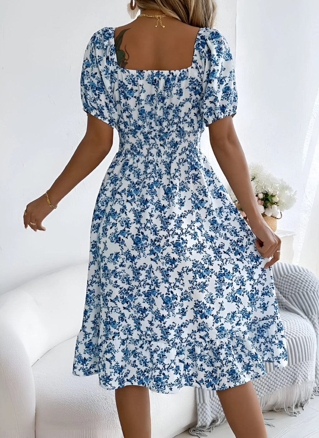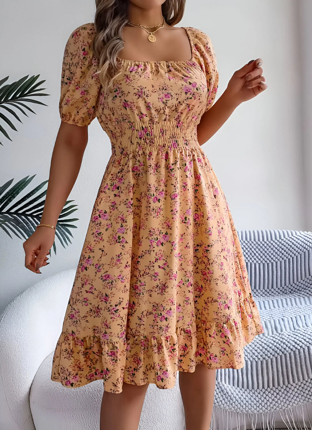 Step into effortless charm with this floral midi dress, designed to bring out your femininity with its romantic details. The flattering square neckline and puff sleeves add a timeless touch, while the smocked bodice ensures a comfortable, figure-hugging fit. Whether for a garden party or a casual day out, this dress is your go-to choice for refined yet relaxed style.