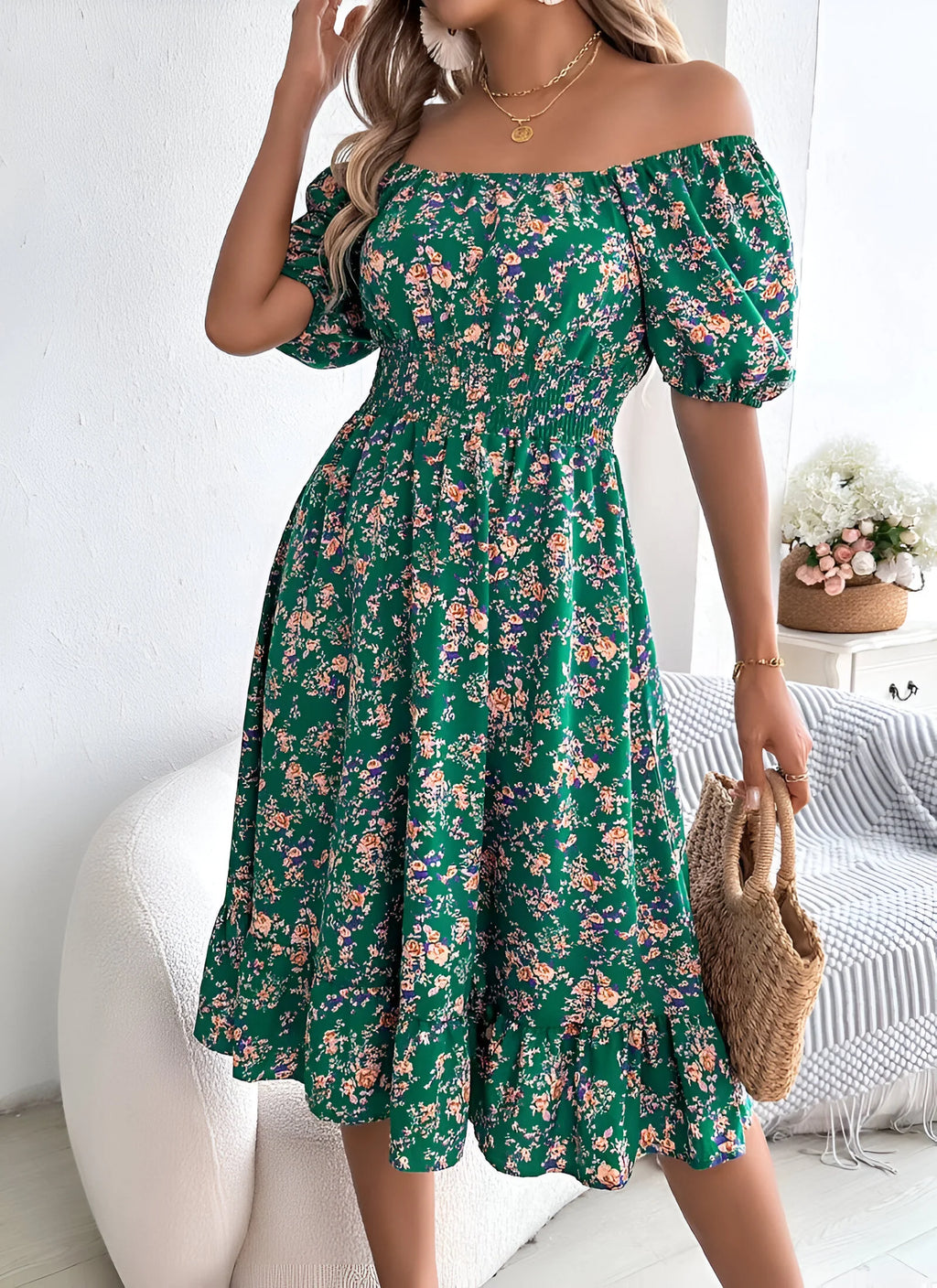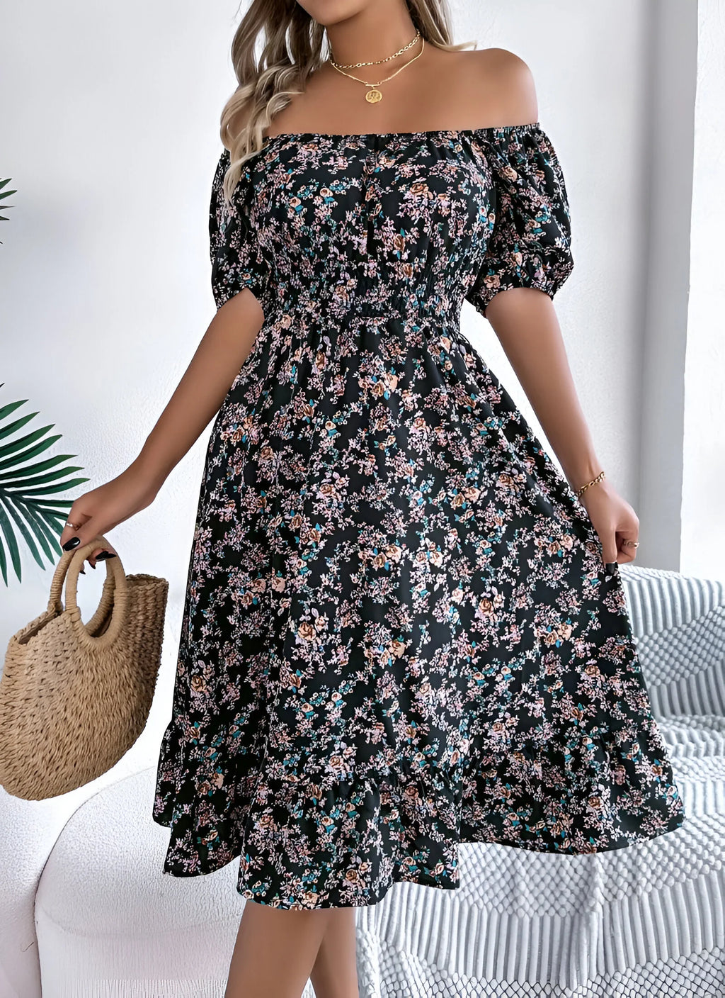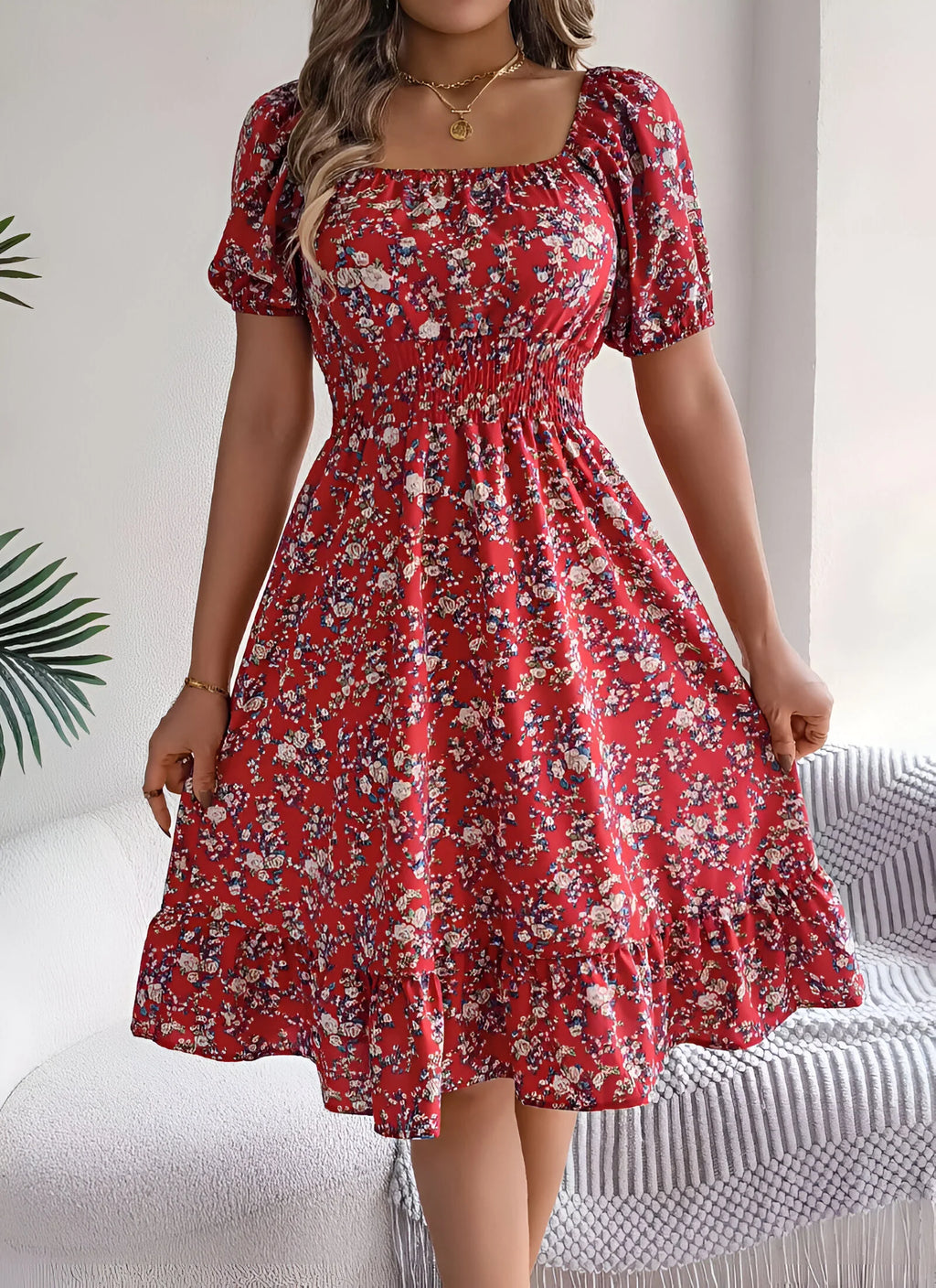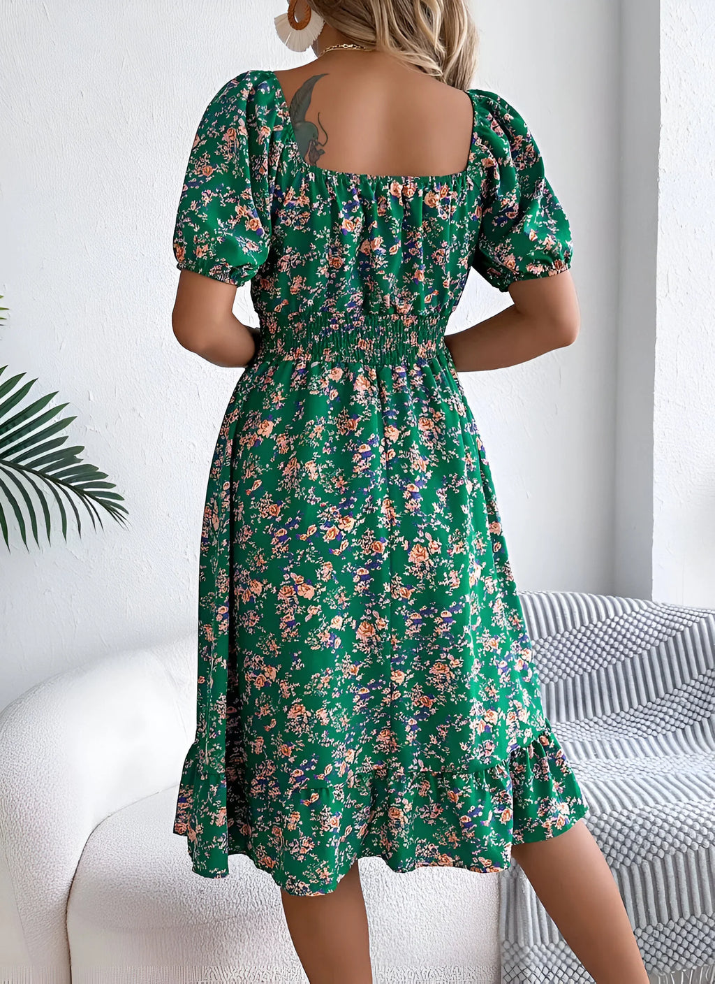 Step into effortless charm with this floral midi dress, designed to bring out your femininity with its romantic details. The flattering square neckline and puff sleeves add a timeless touch, while the smocked bodice ensures a comfortable, figure-hugging fit. Whether for a garden party or a casual day out, this dress is your go-to choice for refined yet relaxed style.