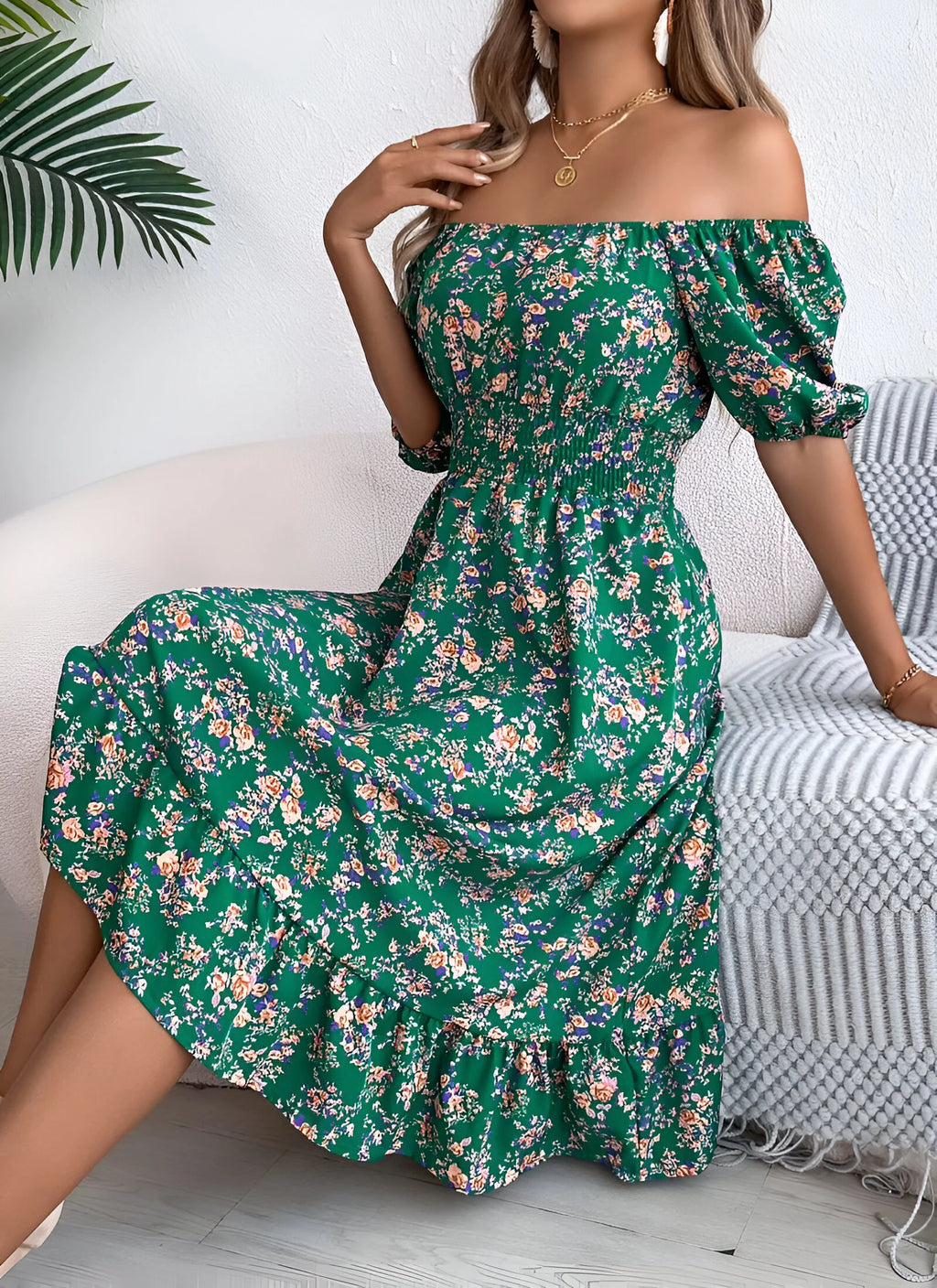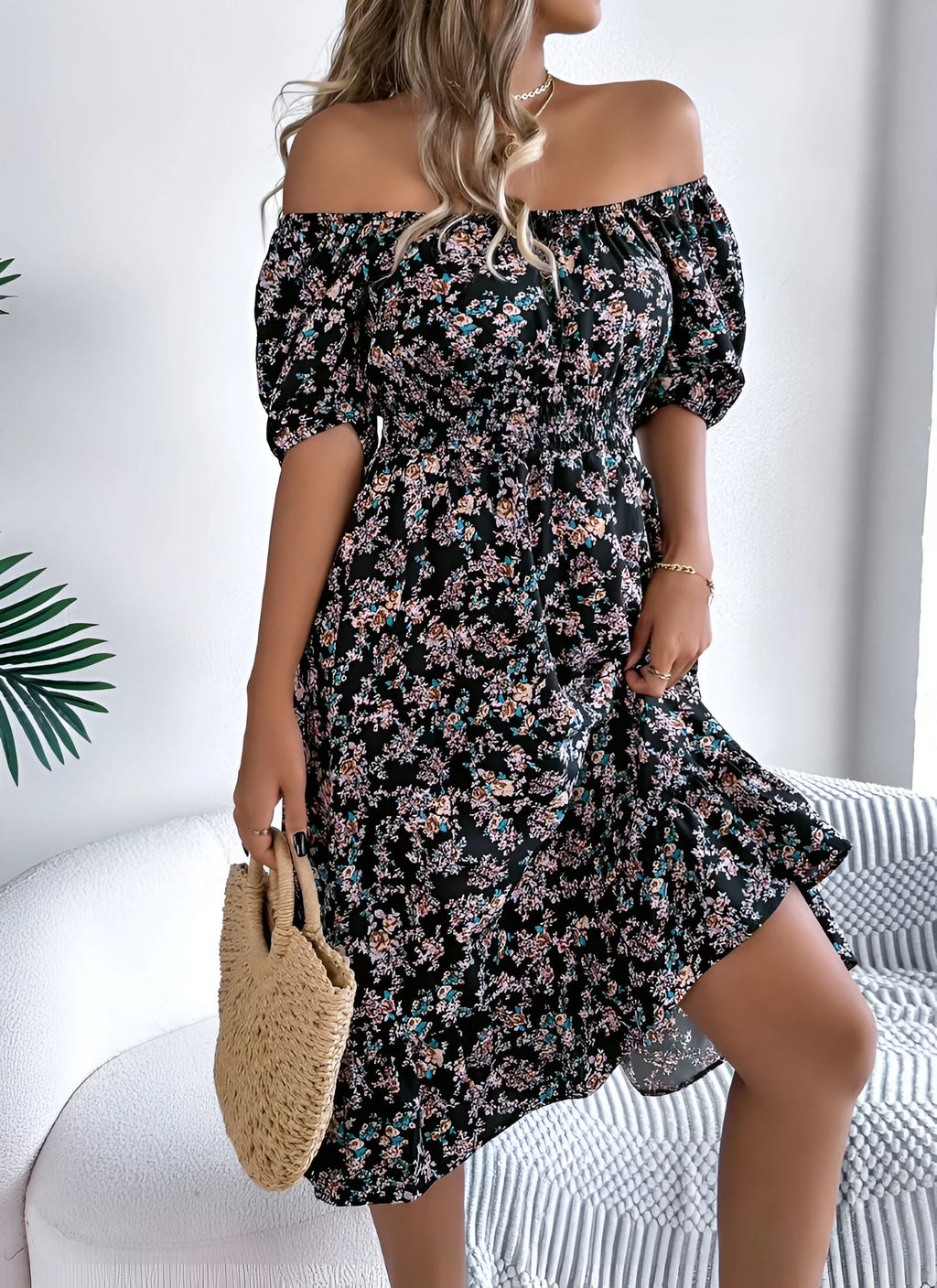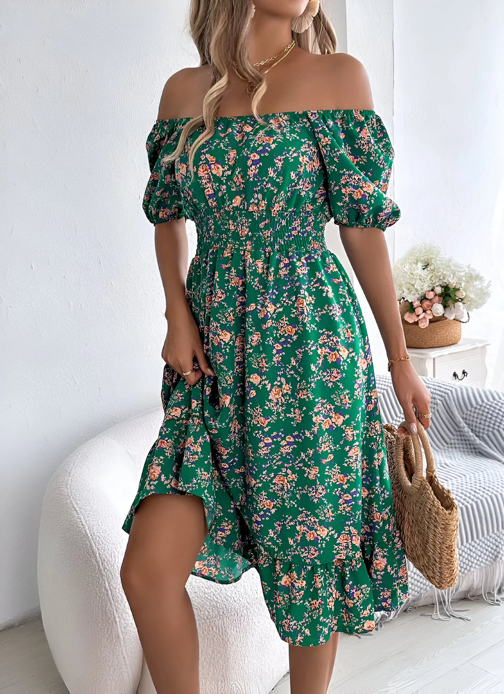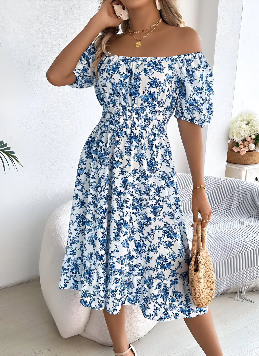 Step into effortless charm with this floral midi dress, designed to bring out your femininity with its romantic details. The flattering square neckline and puff sleeves add a timeless touch, while the smocked bodice ensures a comfortable, figure-hugging fit. Whether for a garden party or a casual day out, this dress is your go-to choice for refined yet relaxed style.
