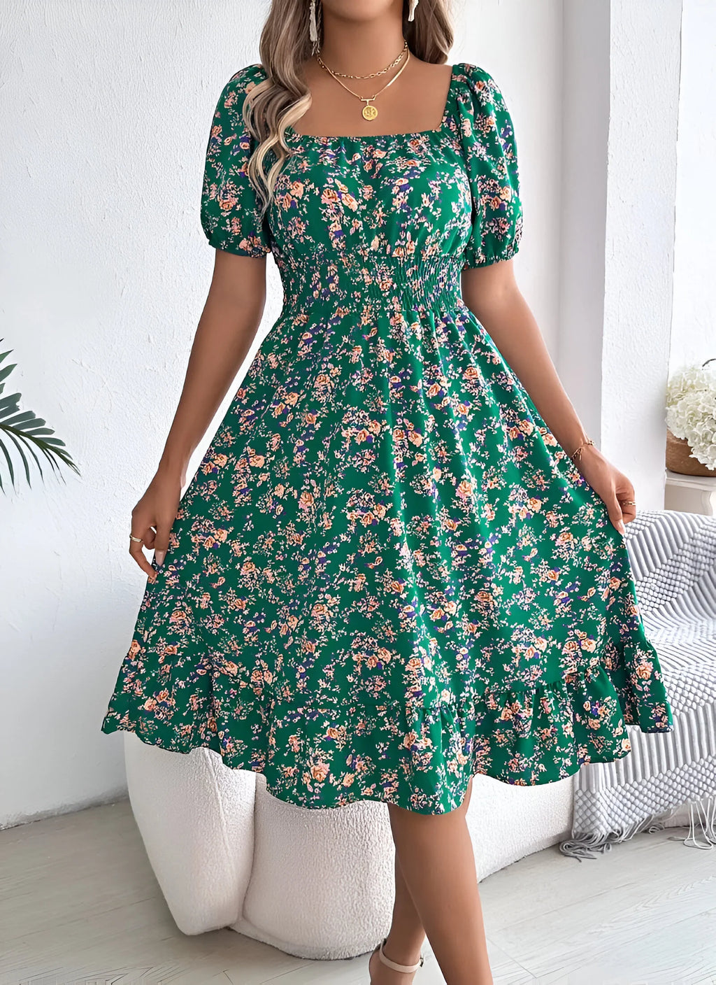 Floral Midi Dress with Puff Sleeves and Square Neck
