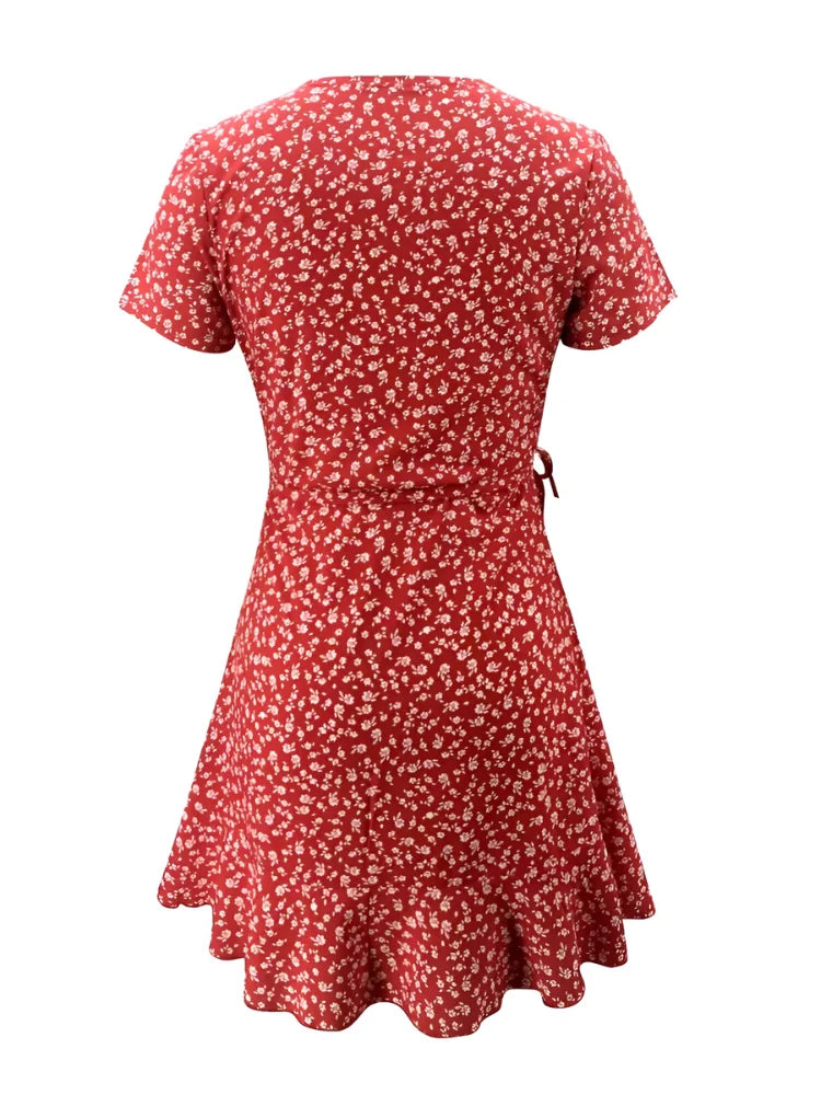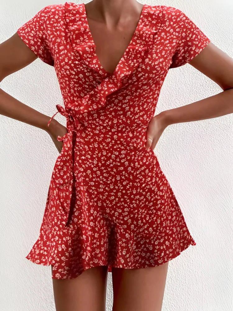 With a deep v-neck and short ruffle sleeves, this dress is designed to showcase your elegance. The lively floral print and flowy hemline add a playful touch, making it a versatile choice for everything from casual hangouts to special celebrations. Style it with your favorite accessories for a polished look.