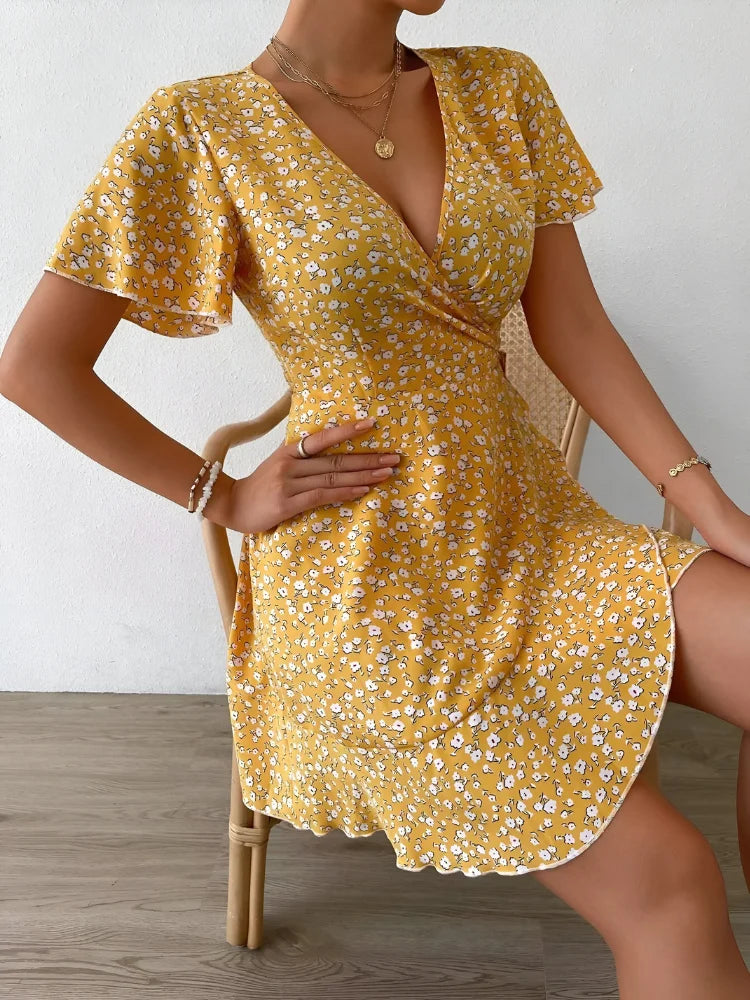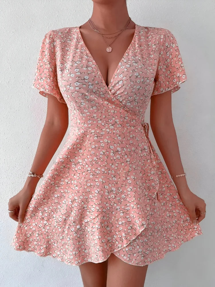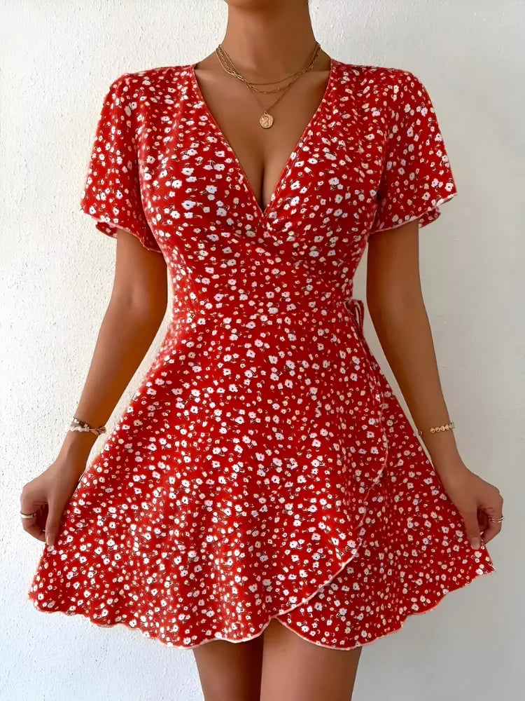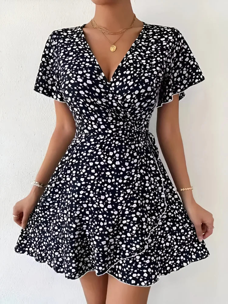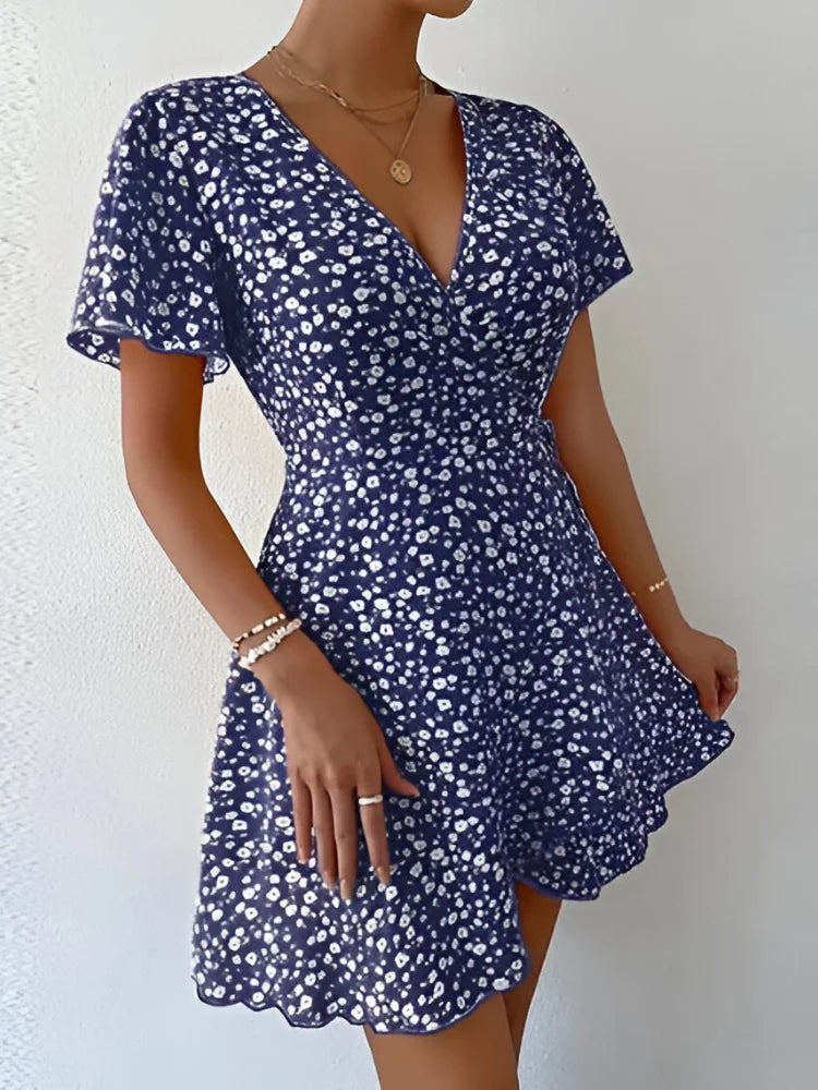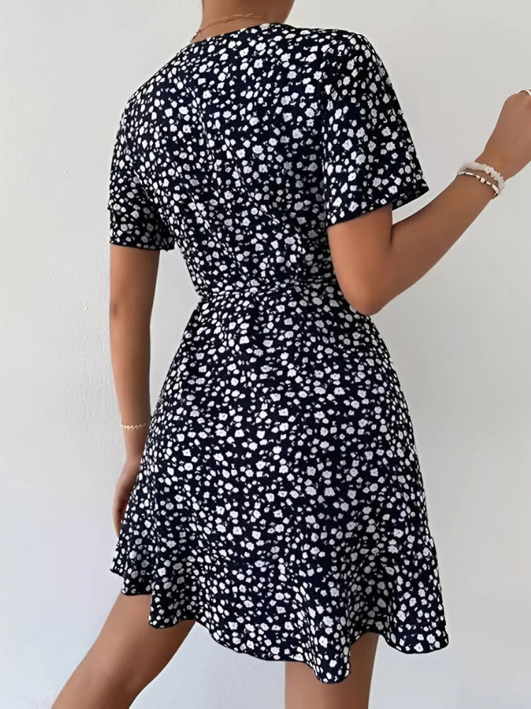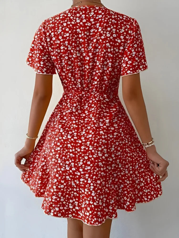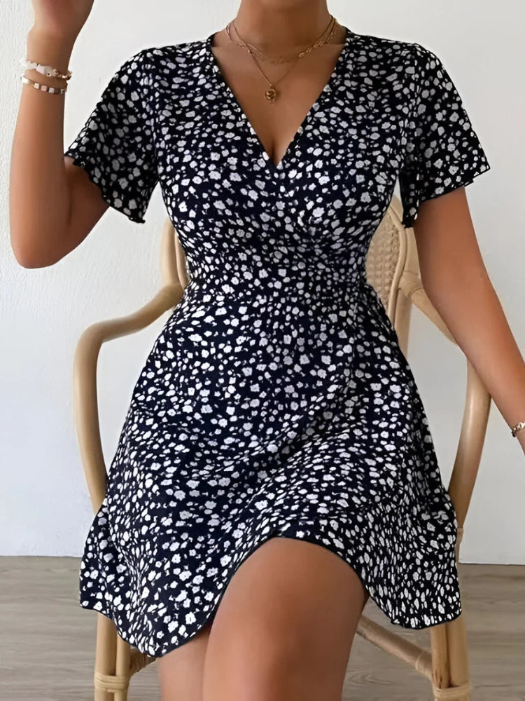 This lightweight and soft mini dress is designed with a flattering A-line silhouette, featuring a ditsy floral print, ruched detailing, puff short sleeves, and a chic V-neck. The high waist and flare hem create a stylish yet comfortable look, perfect for any occasion.