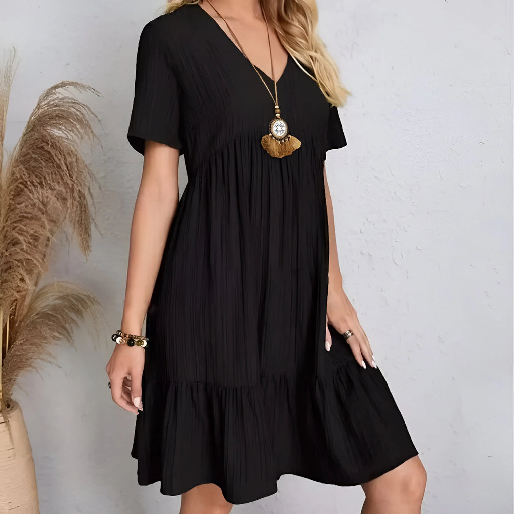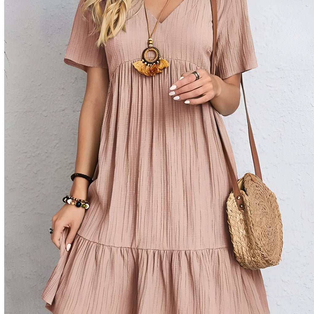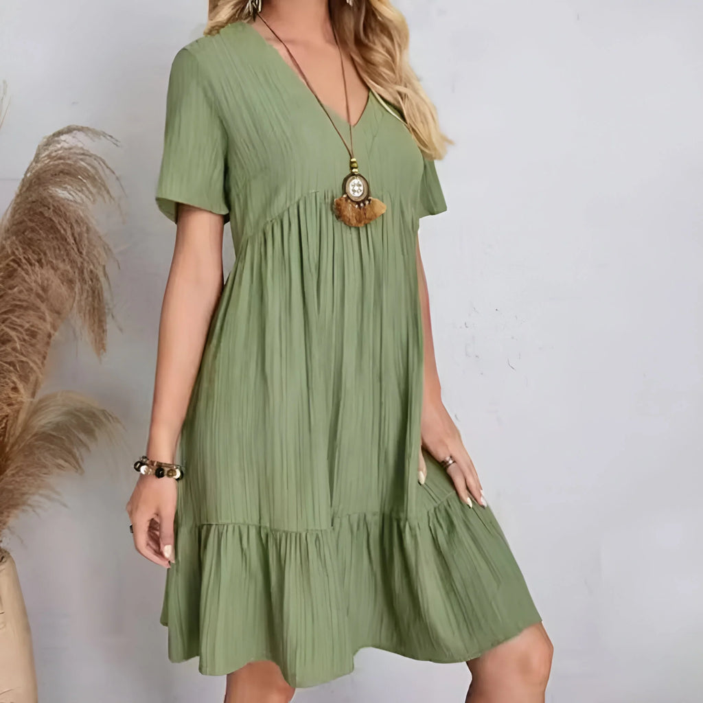 Designed with a flattering V-neck and flowy ruffle details, this dress is the perfect blend of chic and breathable comfort. Its lightweight fabric keeps you feeling fresh on warm days, making it an ideal choice for vacations, casual outings, or weekend brunch.