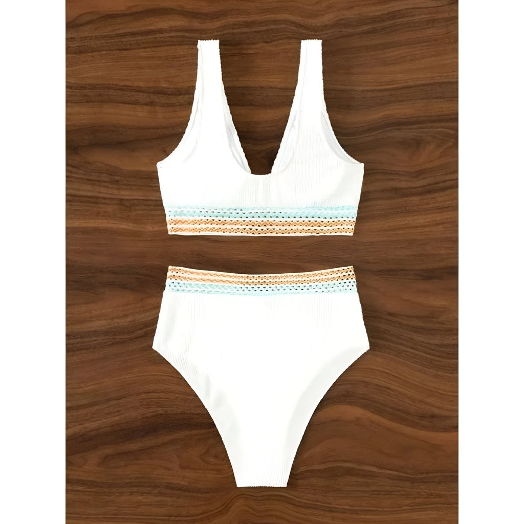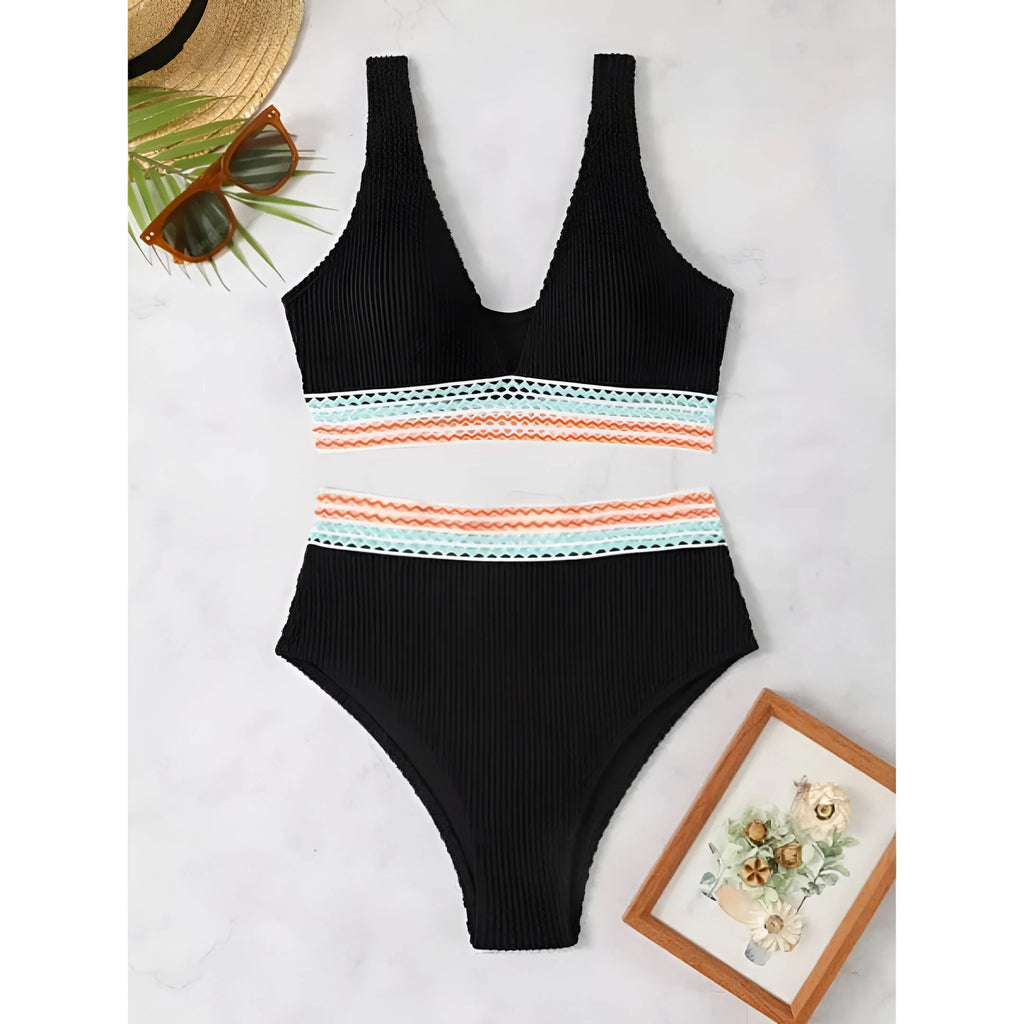 This high-waist bikini set features beautiful multicolored crochet accents for a unique and fashionable look. Whether you're at the beach or lounging by the pool, this set offers the perfect balance of comfort and style.
