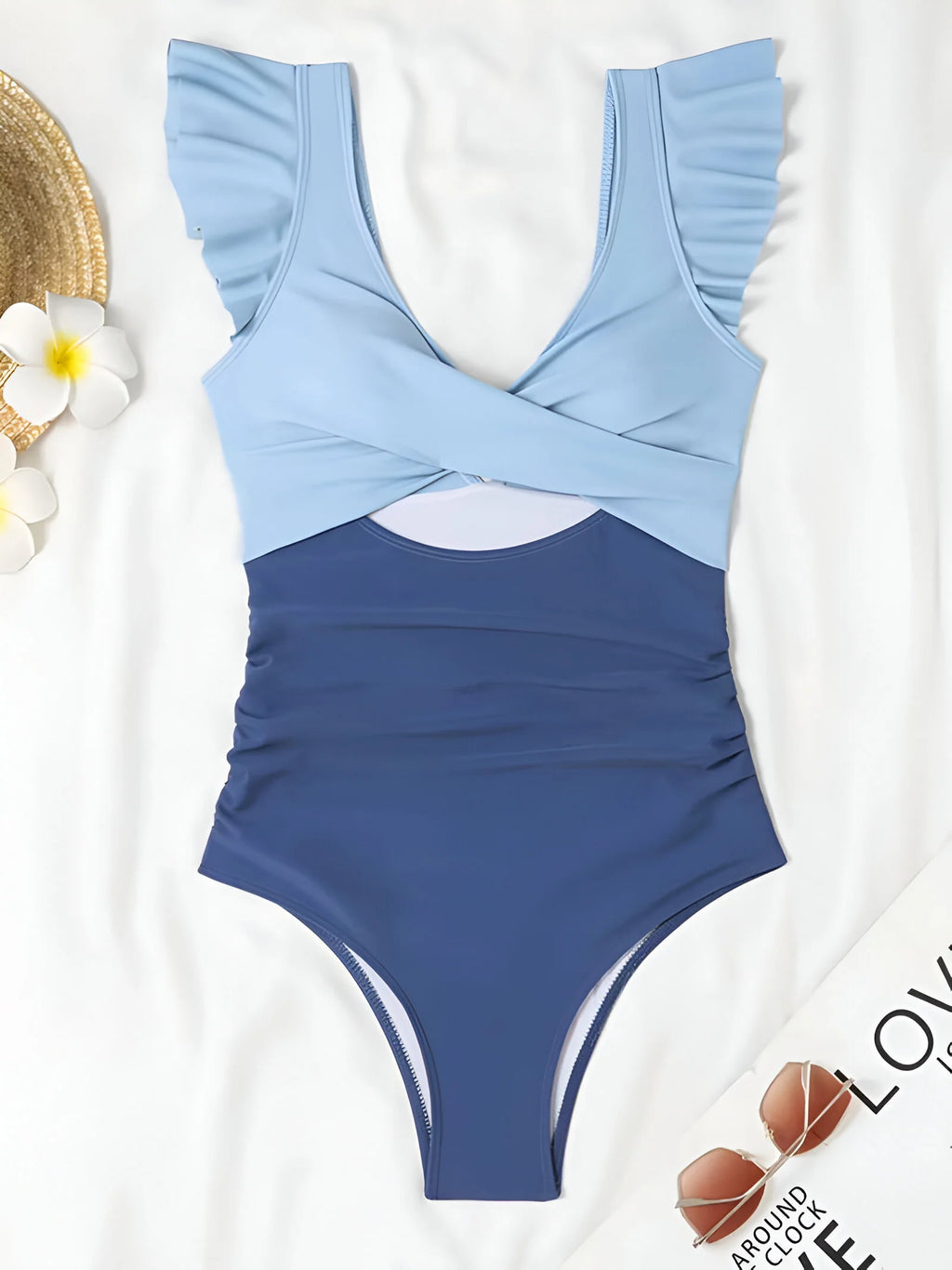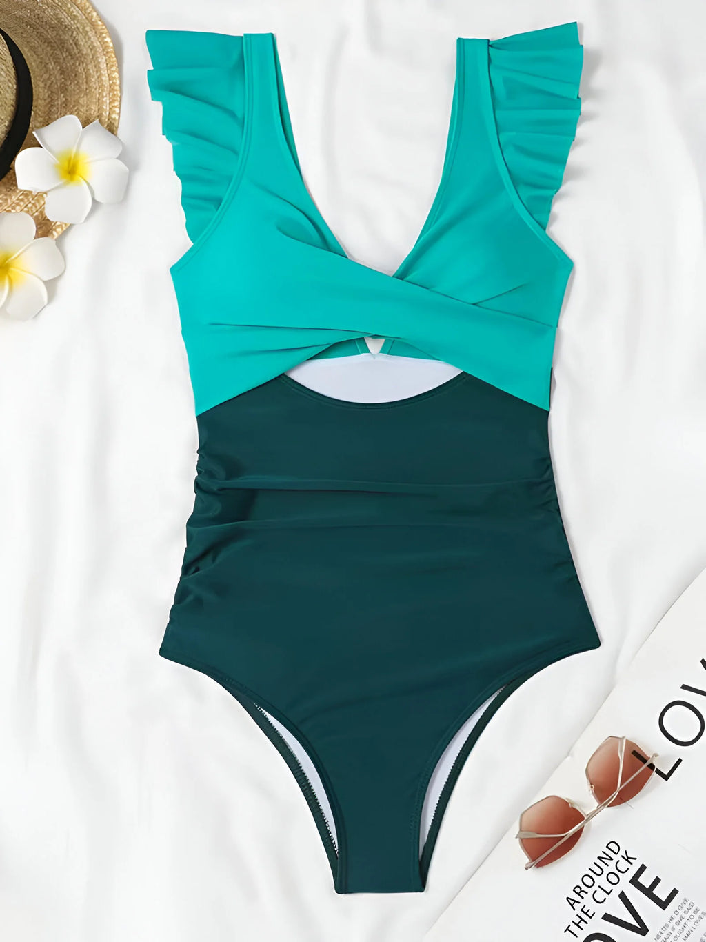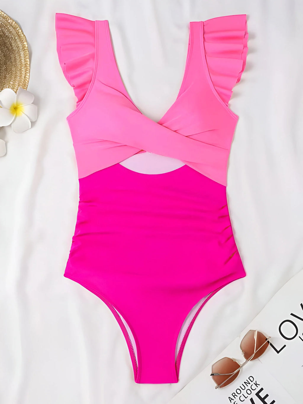 Make waves at the beach or pool with this chic one-piece swimsuit. Featuring a trendy hollow-out cross design and playful ruffles, it offers a perfect balance of sophistication and style. The thoughtfully designed silhouette flatters your figure, making it a go-to choice for women seeking confidence and elegance.