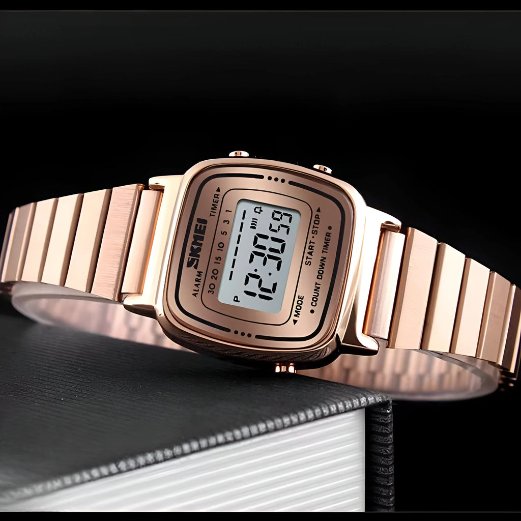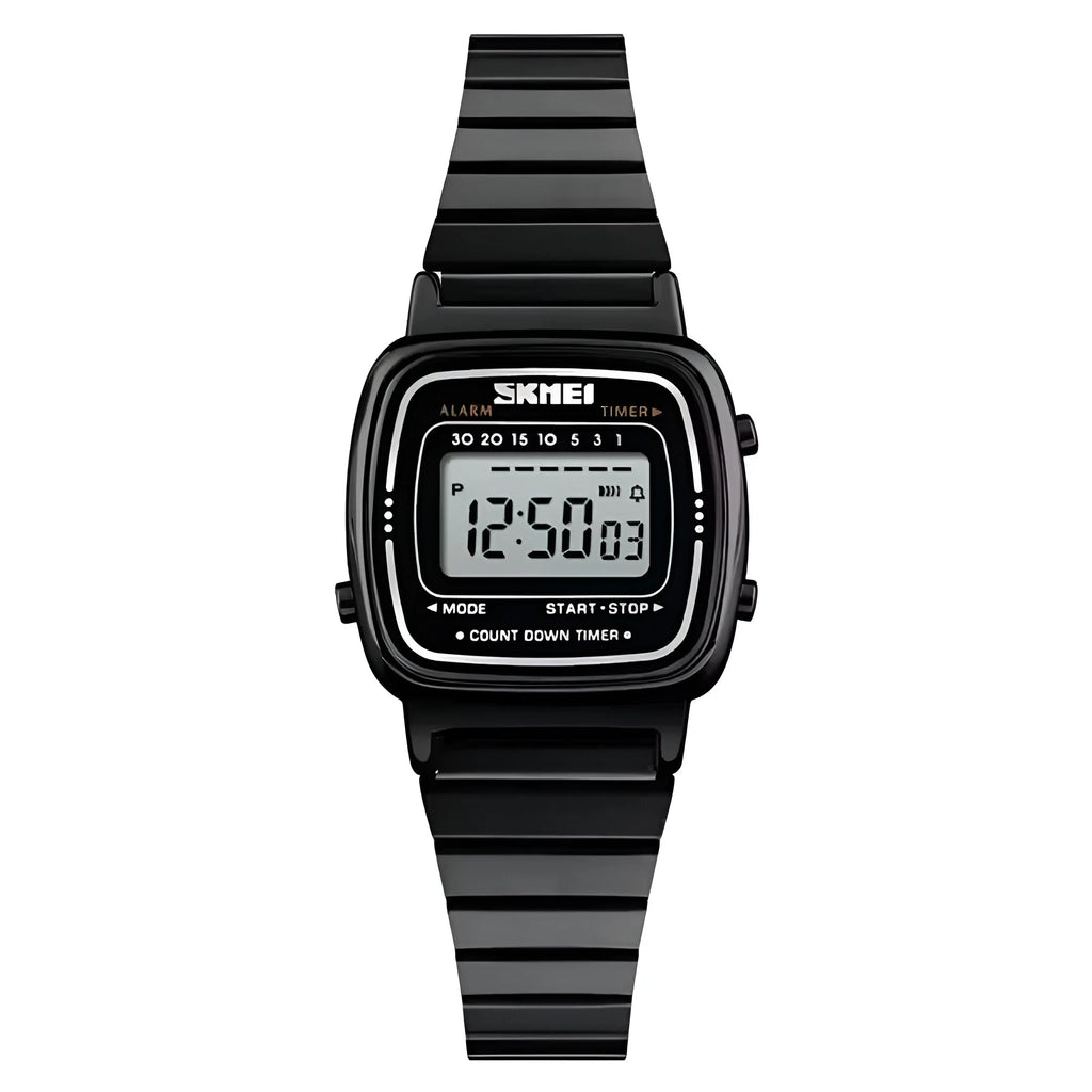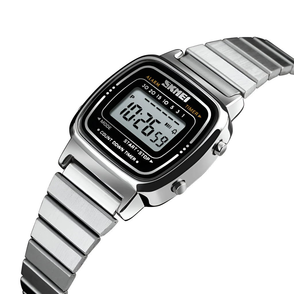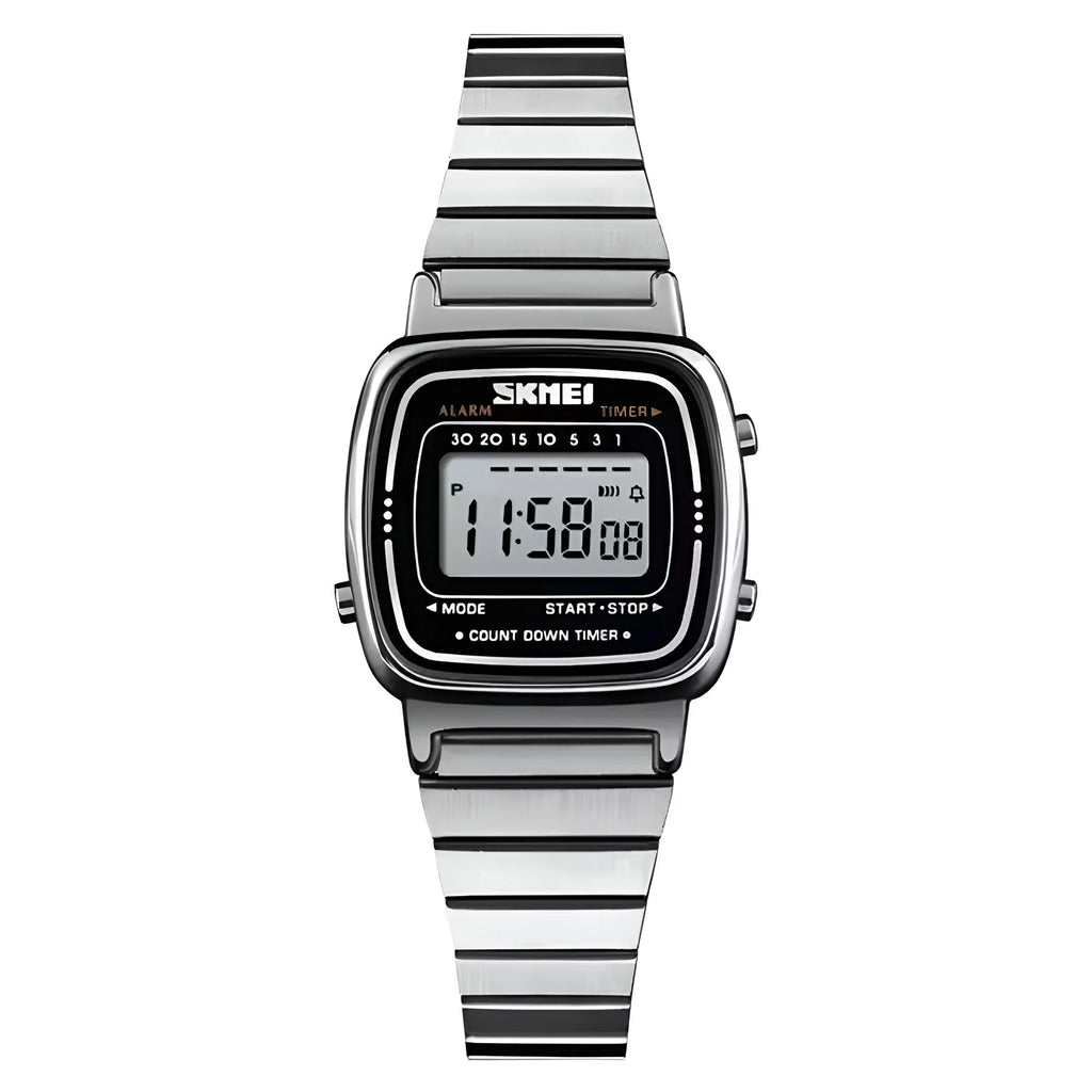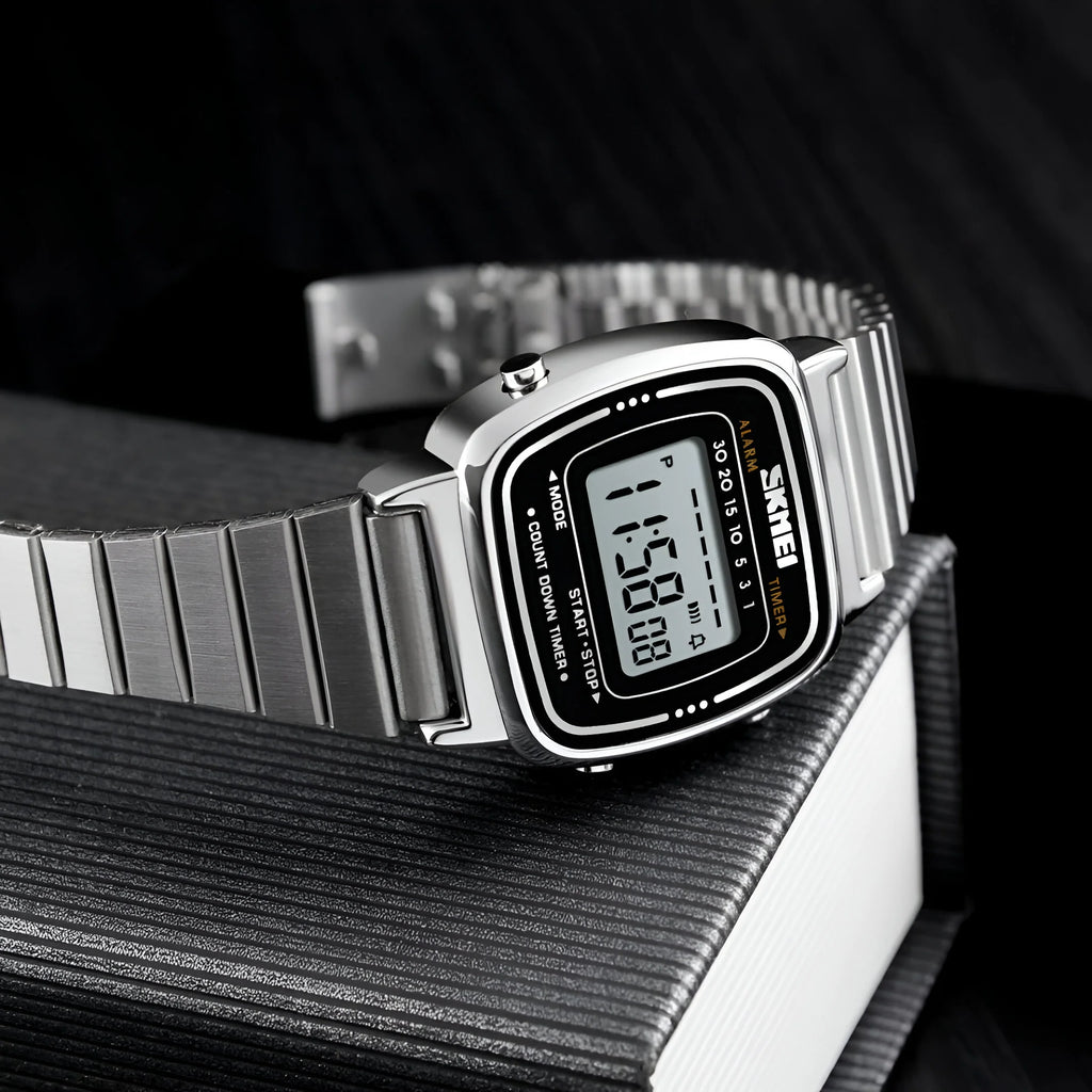 This sleek digital watch offers a modern design with a clear display and a comfortable stainless steel band. With multiple color options and water resistance, it’s perfect for everyday wear while keeping you on schedule with its smart features.
