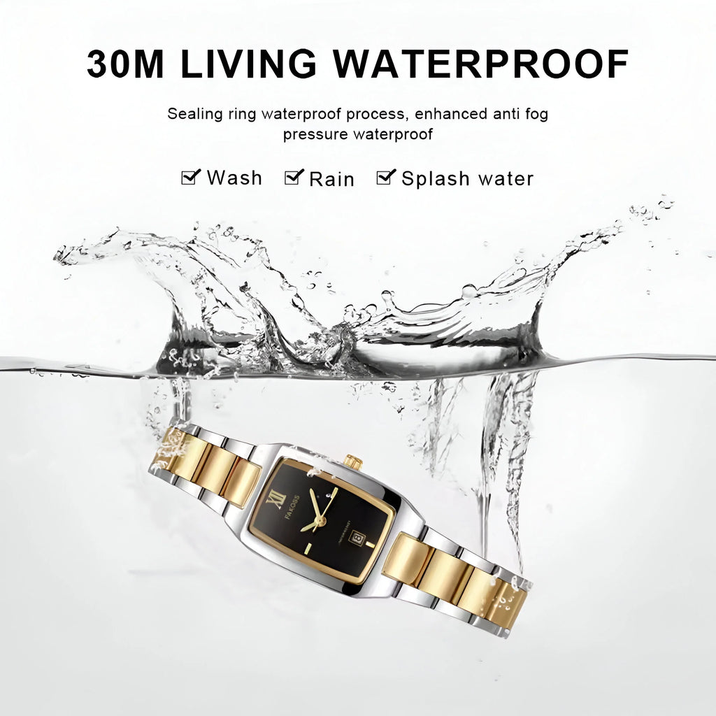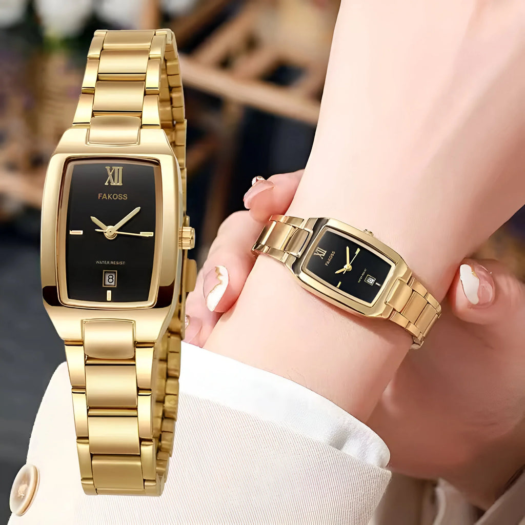 Sleek, sophisticated, and effortlessly stylish—the WWOOR women's rectangular watch is a perfect blend of classic style and contemporary minimalism. The gold-tone stainless steel case frames a striking black dial, creating a refined look that suits any occasion.