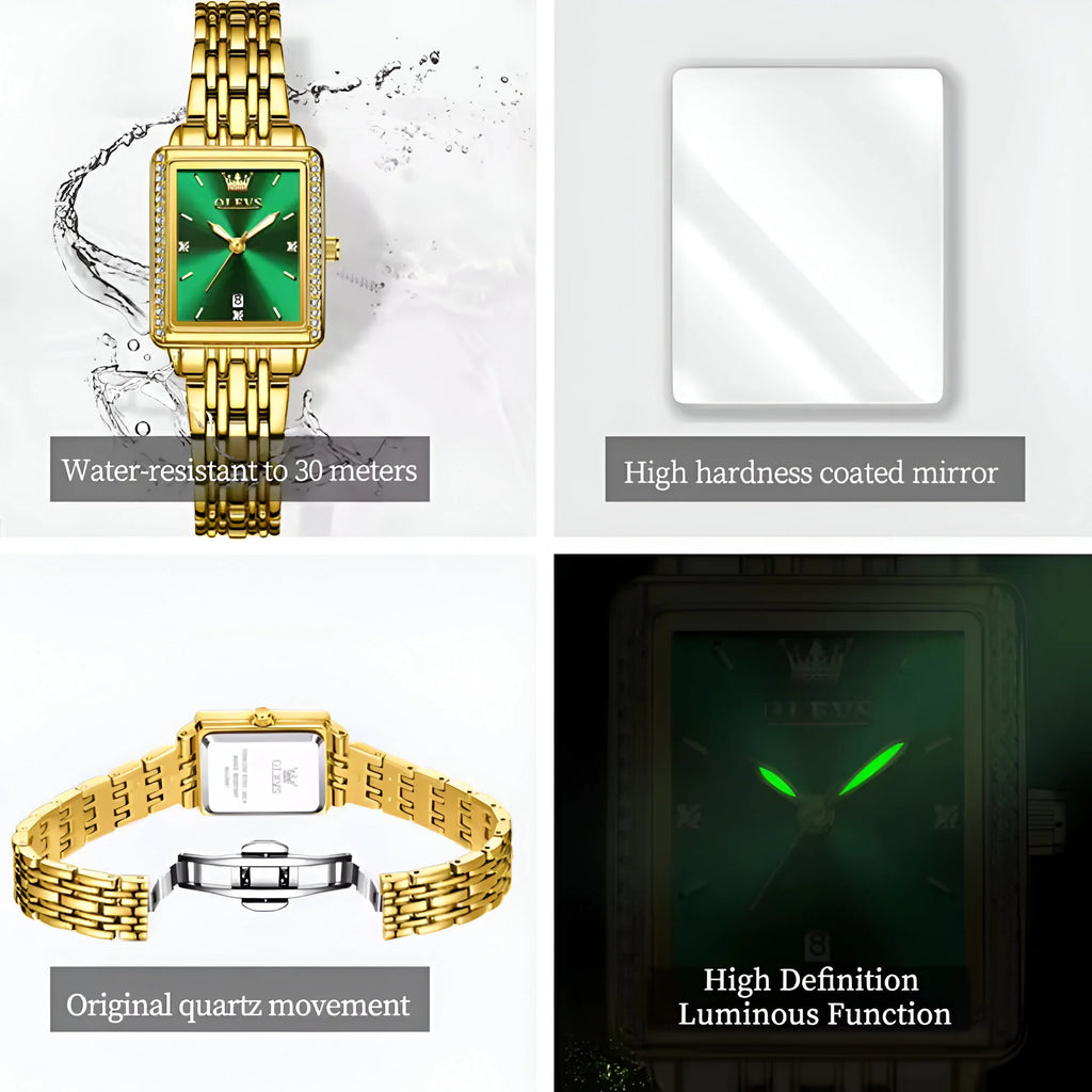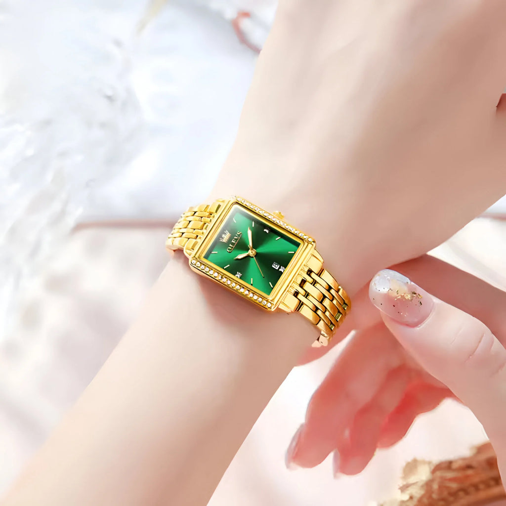 Designed for those who appreciate fine craftsmanship, this watch offers a perfect balance of style and durability. Its sleek rectangular dial, accented with a luxurious gold finish and sparkling details, makes it a standout accessory for any occasion.