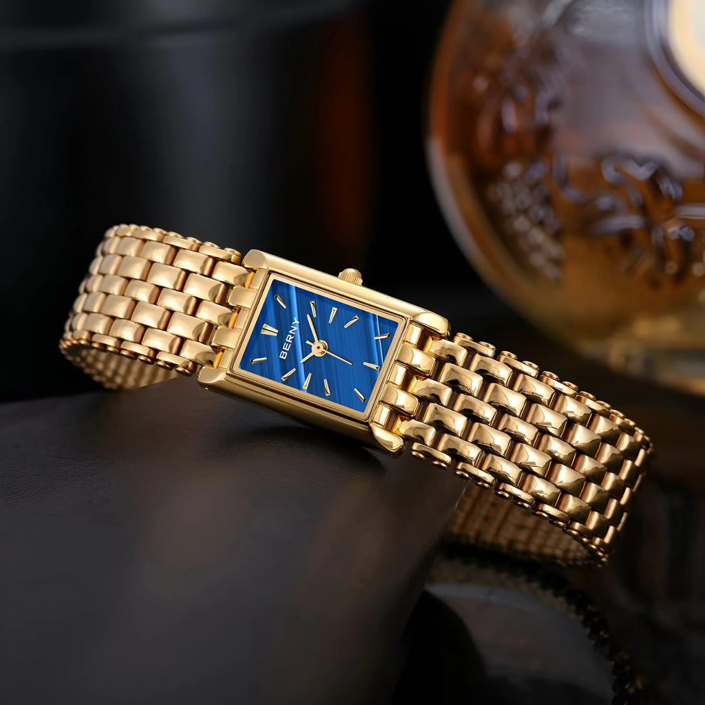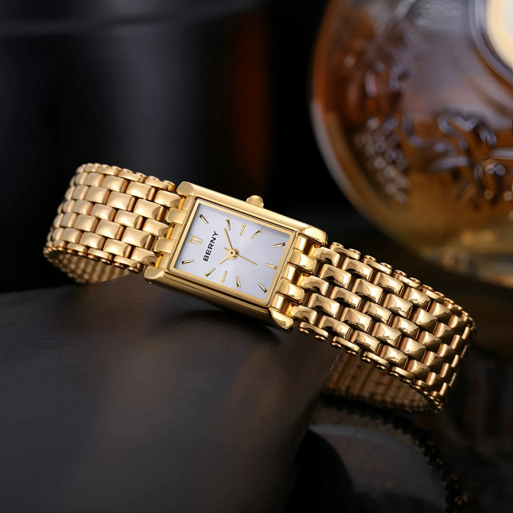 Designed for the modern woman, this watch blends sophistication with functionality. The sleek rectangular case, gold-plated finish, and minimalist dial make it a versatile accessory for both casual and formal occasions. Whether you're at the office, out with friends, or attending a special event, this watch adds a refined touch to any outfit.